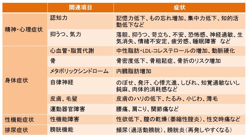 冷えやのぼせなどの自律神経失調症の症状、不安・抑うつ・不眠などの精神症状、骨粗しょう症・動脈硬化・認知機能の低下といった症状がみられます。
